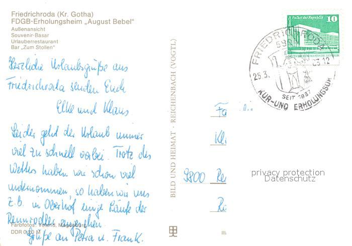 72987596 alte Postkarte Friedrichsroda FDGB Erholungsheim August Bebel postalisch gelaufen Erhaltung siehe scans [LiesaD40] KatCode: 11110016067029