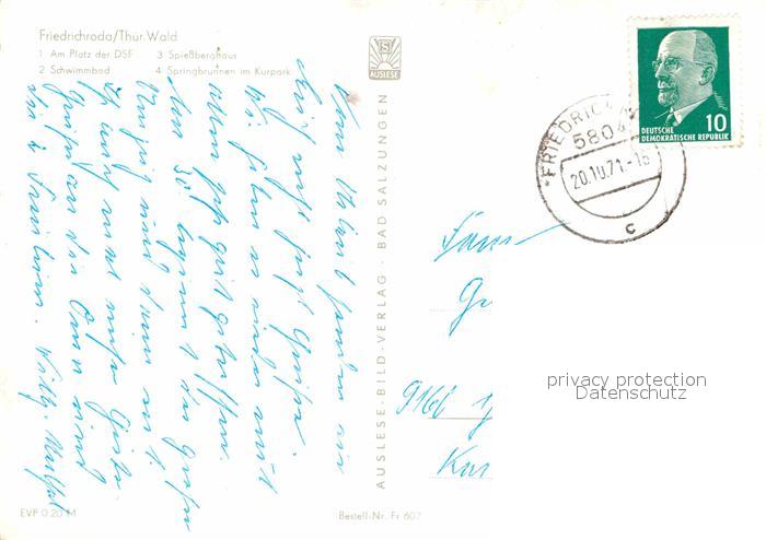 72656985 alte Postkarte Friedrichsroda Platz der DSF Spiessberghaus Springbrunnen im Kurpark postalisch gelaufen Erhaltung siehe scans [LiesaD40] KatCode: 11110016067029