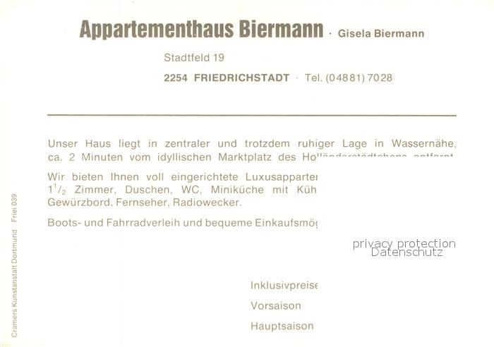73161257 Friedrichstadt Eider Appartementhaus Biermann postalisch nicht gelaufen Werbekarte (keine Postkarte) Erhaltung siehe scans [KathaD81] KatCode: 11110001054033