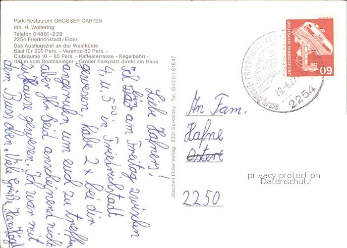 72296868 alte Postkarte Friedrichstadt Eider Park Restaurant Grosser Garten Ausflugsziel postalisch gelaufen Erhaltung siehe scans KatCode: 11110001054033