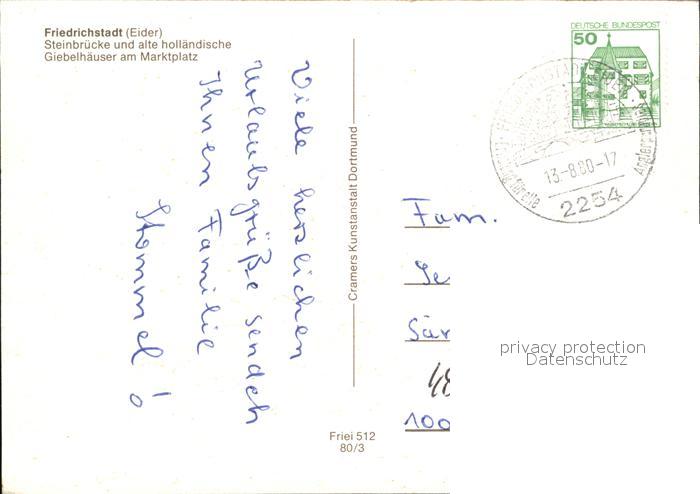 72600385 alte Postkarte Friedrichstadt Eider Steinbruecke alte hollaendische Giebelhaeuser Marktplatz postalisch gelaufen Erhaltung siehe scans [FriedD77] KatCode: 11110001054033