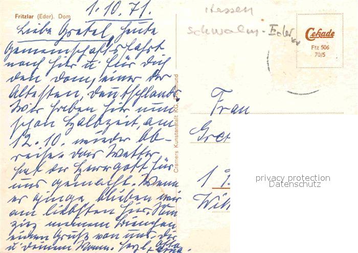 72885564 alte Postkarte Fritzlar Dom postalisch gelaufen Erhaltung siehe scans [FriedD77] KatCode: 11110006634005