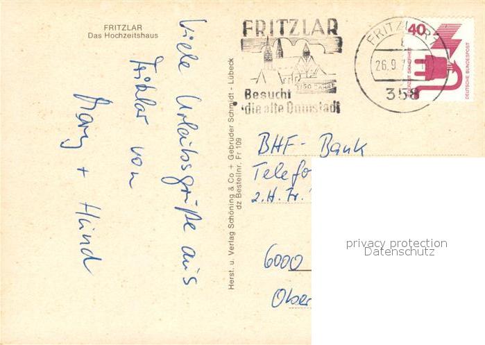 73229962 alte Postkarte Fritzlar Hochzeitshaus postalisch gelaufen Erhaltung siehe scans [KathaD81] KatCode: 11110006634005