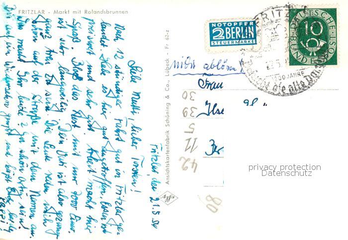73873566 alte Postkarte Fritzlar Markt mit Rolandsbrunnen postalisch gelaufen Erhaltung siehe scans [WerneD78] KatCode: 11110006634005
