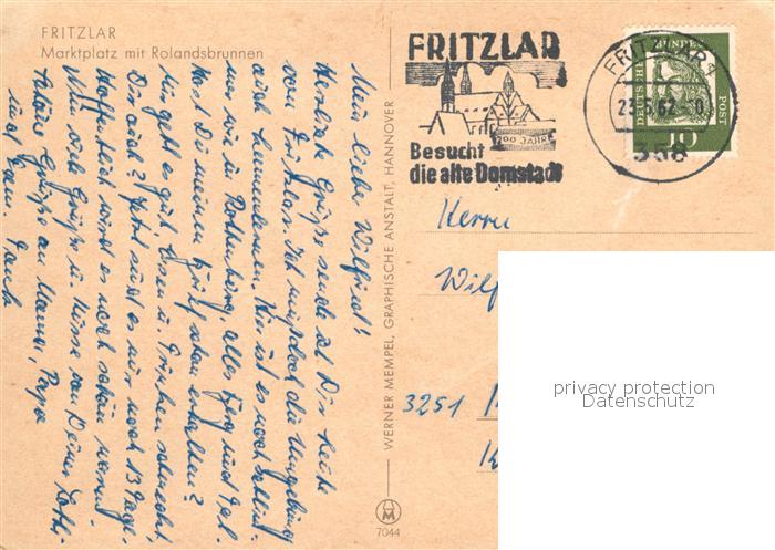 72990502 alte Postkarte Fritzlar Marktplatz mit Rolandsbrunnen Fachwerkhaeuser Altstadt postalisch gelaufen Erhaltung siehe scans [FriedD77] KatCode: 11110006634005