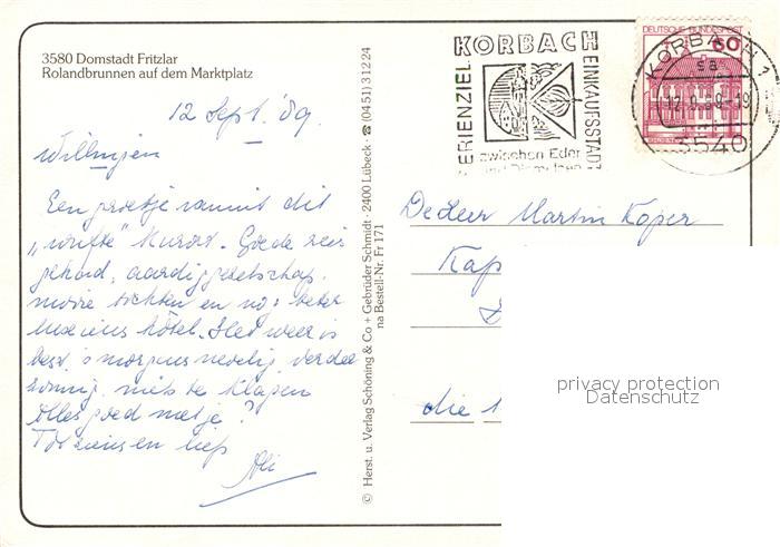 73047699 alte Postkarte Fritzlar Rolandbrunnen auf dem Markt postalisch gelaufen Erhaltung siehe scans [WerneD78] KatCode: 11110006634005