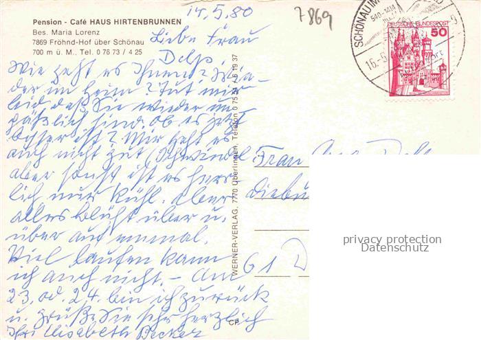 74038019 alte Postkarte Froehnd Wiesental Schwarzwald BW Cafe Haus Hirtenbrunnen postalisch gelaufen Erhaltung siehe scans [WerneD78] KatCode: 11110008336025