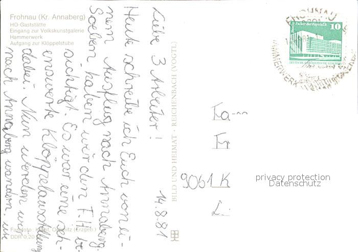 72418390 alte Postkarte Frohnau Annaberg HO Gaststaette Volkskunstgalerie Hammerwerk Kloeppelstube postalisch gelaufen Erhaltung siehe scans KatCode: 11110014171010