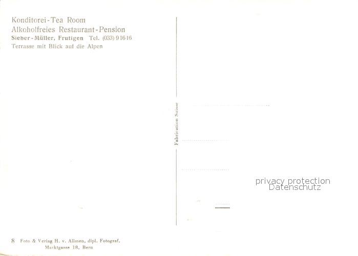 13664353 Frutigen BE Konditorei Tea Room Restaurant Pension Sieber Mueller Terrasse Alpenblick postalisch nicht gelaufen Erhaltung siehe scans [FriedD77] KatCode: 11470060170204