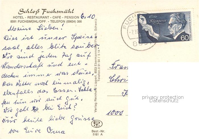 73765640 alte Postkarte Fuchsmuehl Schloss Fuchsmuehl Hotel Restaurant postalisch gelaufen Erhaltung siehe scans [WerneD78] KatCode: 11110009377119
