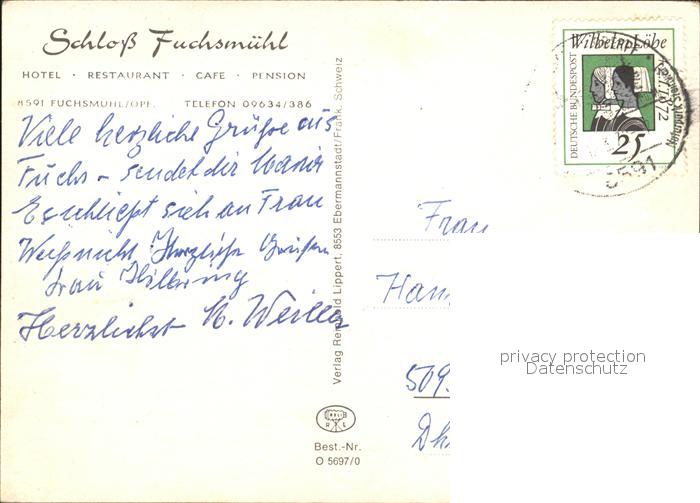 72105754 alte Postkarte Fuchsmuehl Schloss Fuchsmuehl Hotel Restaurant Gaststube Kaminzimmer postalisch gelaufen Erhaltung siehe scans KatCode: 11110009377119