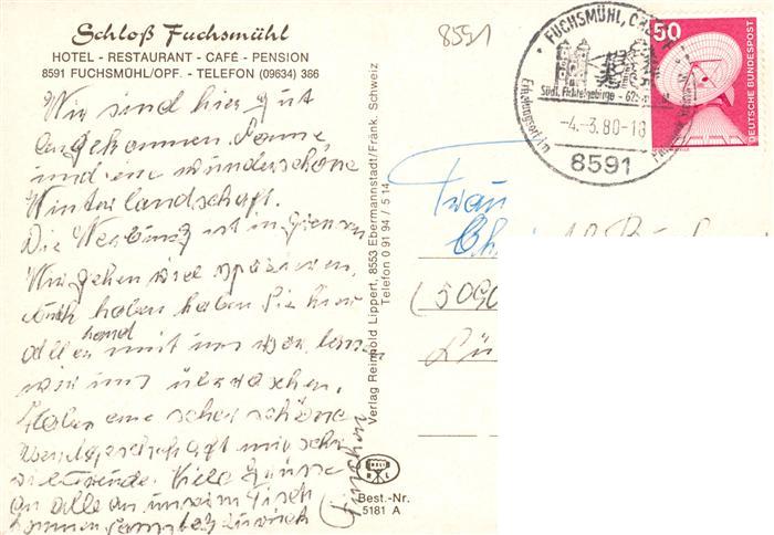 73936954 alte Postkarte Fuchsmuehl Schloss Fuchsmuehl Hotel Restaurant postalisch gelaufen Erhaltung siehe scans [WerneD78] KatCode: 11110009377119