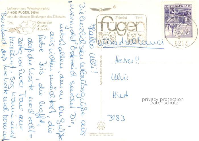 73661576 alte Postkarte Fuegen Fliegeraufnahme mit Sonnwendgebirge postalisch gelaufen Erhaltung siehe scans [WerneD78] KatCode: 11390335070909