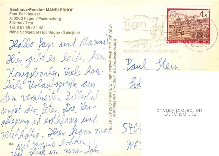 12871479 alte Postkarte Fuegen Gasthaus-Pension Mandlerhof postalisch gelaufen Erhaltung siehe scans [PaolaD17] KatCode: 11390335070909
