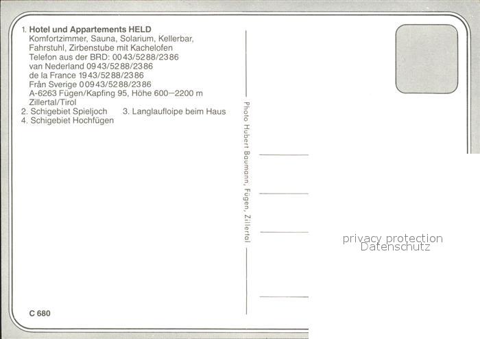 71909484 Fuegen Hotel Held Skigebiet Spieljoch Langlaufloipe Haus Hochfuegel postalisch nicht gelaufen Erhaltung siehe scans KatCode: 11390335070909