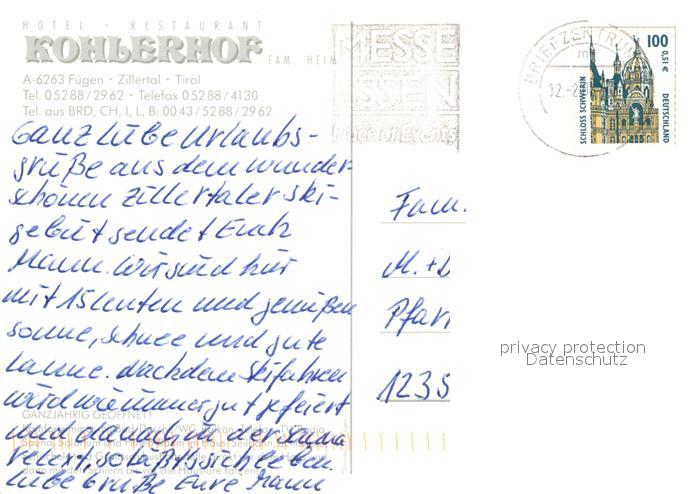 73099811 alte Postkarte Fuegen Hotel Kohlerhof postalisch gelaufen Erhaltung siehe scans [NatalD47] KatCode: 11390335070909