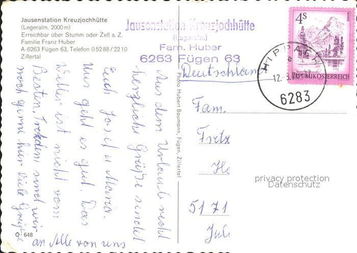 72234508 alte Postkarte Fuegen Kreuzjochhuette postalisch gelaufen Erhaltung siehe scans KatCode: 11390335070909