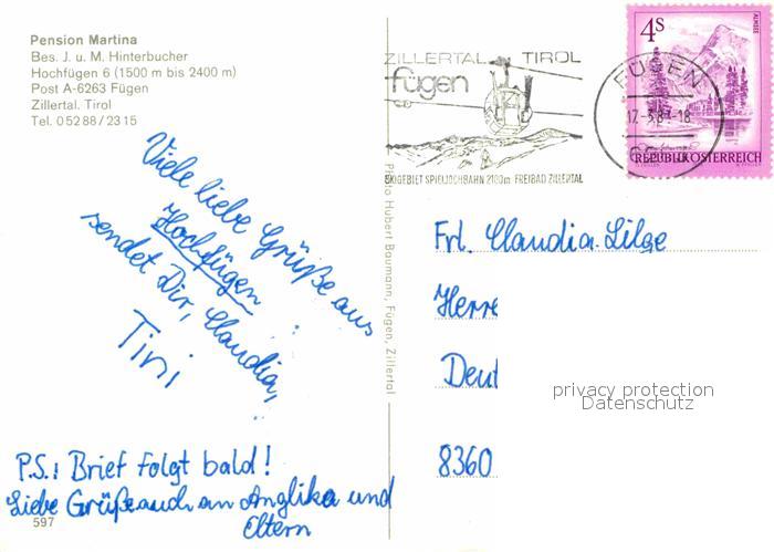 72673471 alte Postkarte Fuegen Pension Martina Winterpanorama Alpen postalisch gelaufen Erhaltung siehe scans [FriedD77] KatCode: 11390335070909