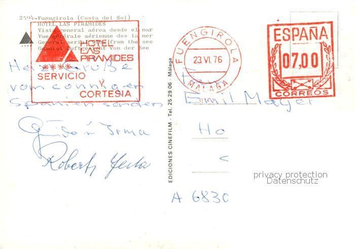 73852037 Fuengirola Costa del Sol ES Hotel Las Piramides Fliegeraufnahme postalisch gelaufen Erhaltung siehe scans [WerneD78] old postcard Wern Katcode 11510