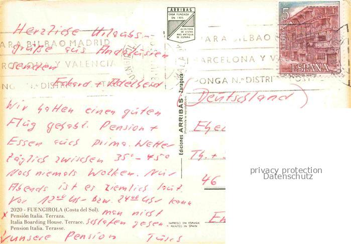 74076344 old postcard FUENGIROLA Costa del Sol ES Pension Italia Terraza postalisch gelaufen Erhaltung siehe scans [FriedD77] KatCode: 11510