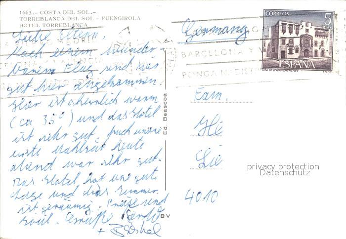old postcard Fuengirola Hotel Torreblanca postalisch gelaufen Erhaltung siehe scans