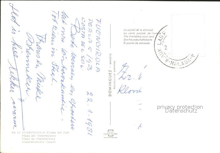 old postcard Fuengirola Plaza del Generalisimo postalisch gelaufen Erhaltung siehe scans