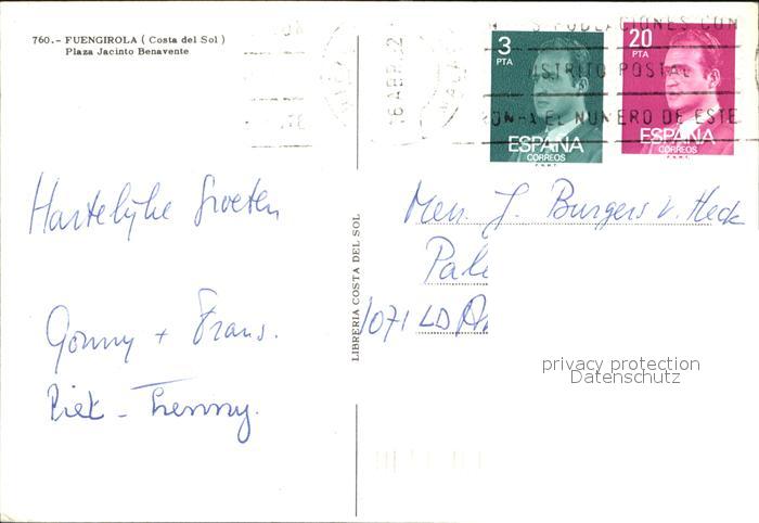 old postcard Fuengirola Plaza Jacinto Benavente postalisch gelaufen Erhaltung siehe scans
