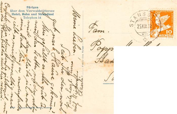 13920727 alte Postkarte Fuerigen Stansstad NW Ansicht vom Vierwaldstaettersee aus Hotel Bahn und Strandbad postalisch gelaufen Erhaltung siehe scans [FriedD77] KatCode: 11470140435278