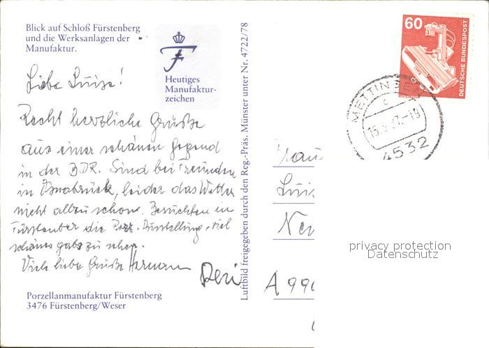 72050906 alte Postkarte Fuerstenberg Boffzen Schloss Werksanlagen Manufaktur %fa postalisch gelaufen Erhaltung siehe scans KatCode: 11110003255004