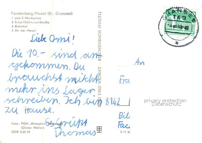 73549353 alte Postkarte Fuerstenberg Havel Marktplatz Ernst Thaelmann Strasse Bahnhof An der Havel postalisch gelaufen Erhaltung siehe scans [WerneD78] KatCode: 11110012065084