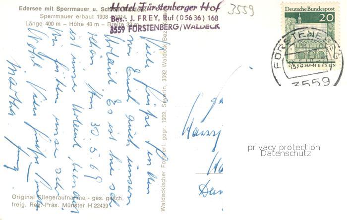 73692362 alte Postkarte Fuerstenberg Waldeck Edersee mit Sperrmauer und Schloss Waldeck postalisch gelaufen Fliegeraufnahme Erhaltung siehe scans [WerneD78] KatCode: 11110006635016