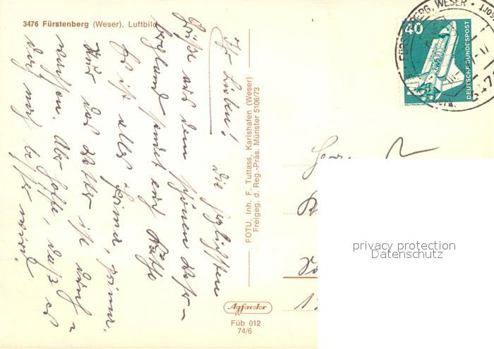 73617996 alte Postkarte Fuerstenberg Weser Fliegeraufnahme postalisch gelaufen Erhaltung siehe scans [FriedD77] KatCode: 11110003255014