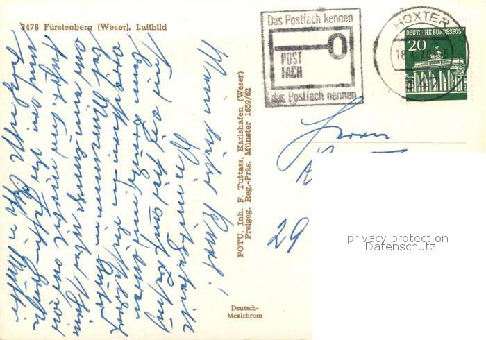 73019001 alte Postkarte Fuerstenberg Weser Fliegeraufnahme postalisch gelaufen Erhaltung siehe scans [WerneD78] KatCode: 11110003255014