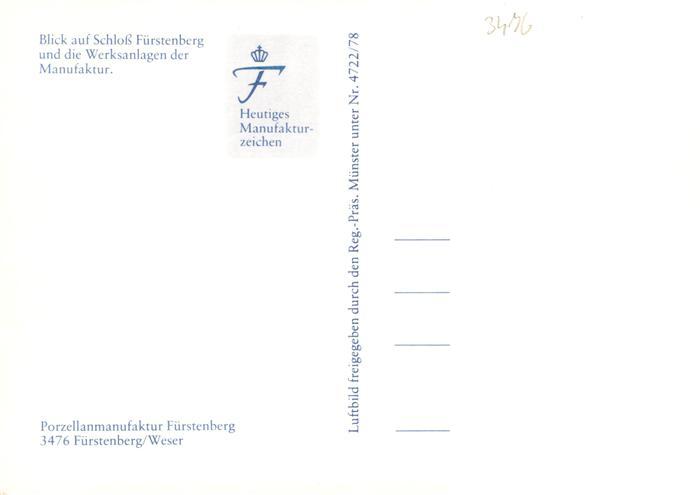 73943991 Fuerstenberg Weser Schloss Fuerstenberg und Werksanlagen der Manufaktur postalisch nicht gelaufen Fliegeraufnahme Erhaltung siehe scans [FriedD77] KatCode: 11110003255014