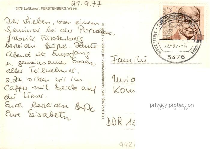 73019135 alte Postkarte Fuerstenberg Weser Schwanenteich Kirche Park Schule postalisch gelaufen Erhaltung siehe scans [WerneD78] KatCode: 11110003255014