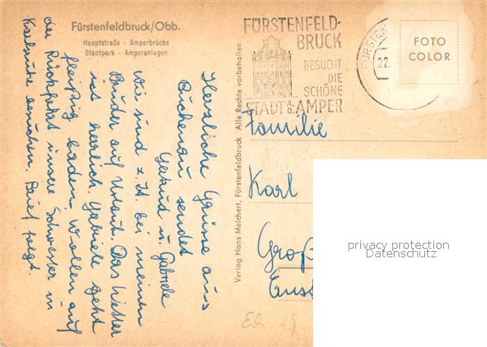 73736712 alte Postkarte Fuerstenfeldbruck Hauptstrasse Amperbruecke Stadtpark Parkanlagen postalisch gelaufen Erhaltung siehe scans [FriedD77] KatCode: 11110009179121