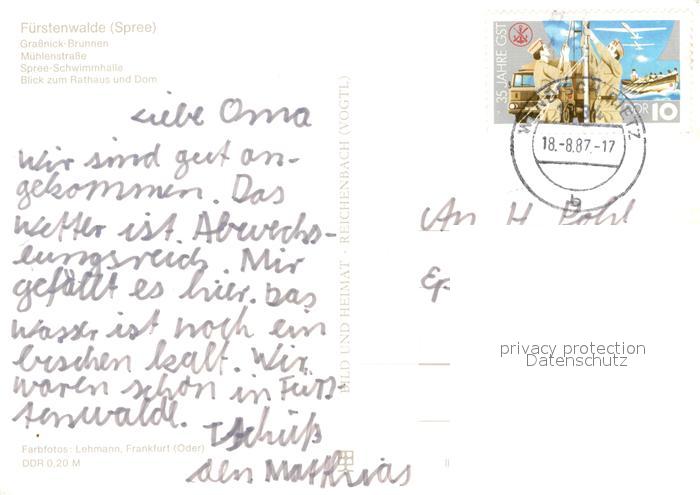 73013703 alte Postkarte Fuerstenwalde Spree Grassnick Brunnen Muehlenstrasse Schwimmhalle Rathaus mit Dom postalisch gelaufen Erhaltung siehe scans [WerneD78] KatCode: 11110012067144