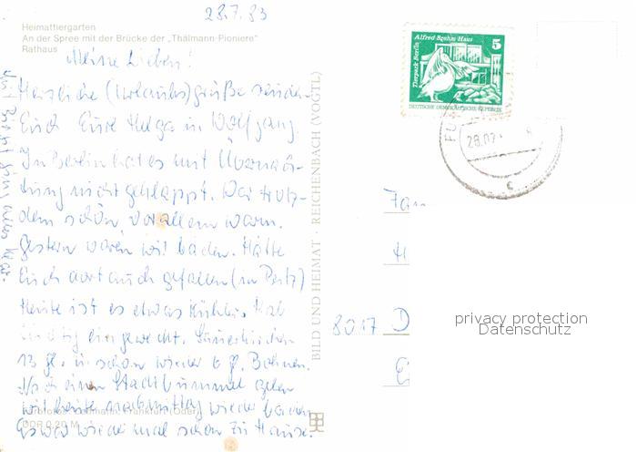 72698731 alte Postkarte Fuerstenwalde Spree Heimattiergarten Spree Bruecke der Thaelmann Pioniere Rathaus postalisch gelaufen Erhaltung siehe scans [FriedD77] KatCode: 11110012067144