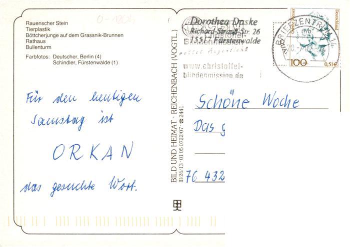 73947386 alte Postkarte Fuerstenwalde Spree Rauenscher Stein Tierplastik Boettcherjunge auf dem Grassnik Brunnen Rathaus Bullenturm postalisch gelaufen Erhaltung siehe scans [WerneD78] KatCode: 11110012067144
