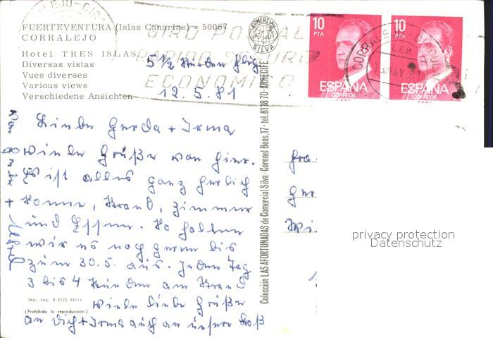 old postcard Fuerteventura Corralejo Hotel Tres Islas postalisch gelaufen Erhaltung siehe scans