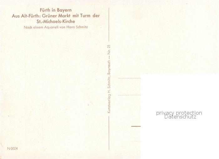 73865876 Fuerth Bayern Altstadt Gruener Markt mit Turm der St. Michaels-Kirche nach Aquarell von Hans Schmitz Kuenstlerkarte postalisch nicht gelaufen Erhaltung siehe scans [FriedD77] KatCode: 11110009563000