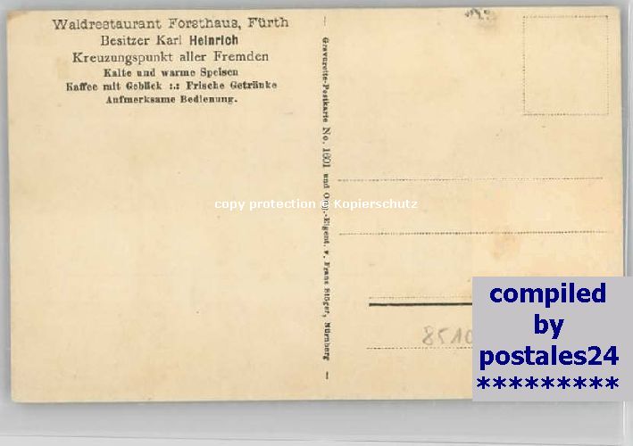 40231305 Fuerth Bayern estaurant Forsthaus ungelaufen ca. 1910 KatCode 11110009563000