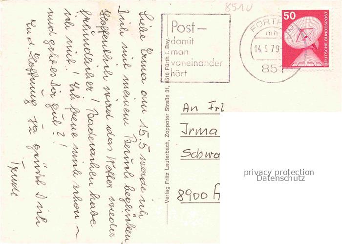 74049059 alte Postkarte FueRTH Bayern Europakanal Rhein-Main-Donau Fahrgastschiffe Frachtkahn Kran postalisch gelaufen Erhaltung siehe scans [FriedD77] KatCode: 11110009563000