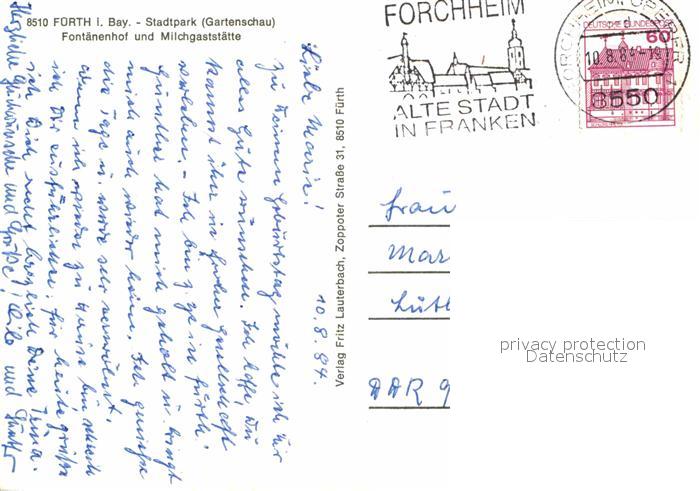 72654462 alte Postkarte Fuerth Bayern Stadtpark Fontaenenhof Milchgaststaette postalisch gelaufen Erhaltung siehe scans [WerneD78] KatCode: 11110009563000