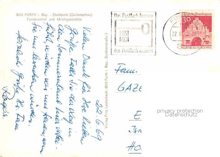 72661214 alte Postkarte Fuerth Bayern Stadtpark Fontaenenhof und Milchgaststaette postalisch gelaufen Erhaltung siehe scans [WerneD78] KatCode: 11110009563000