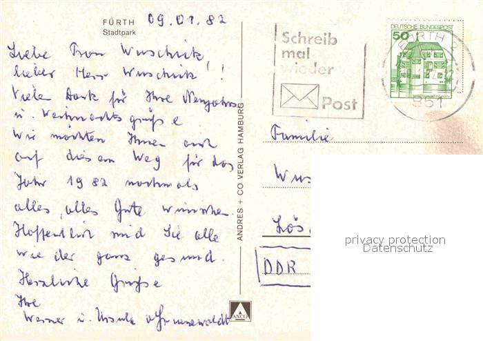 72631513 alte Postkarte Fuerth Bayern Stadtpark postalisch gelaufen Erhaltung siehe scans [LiesaD40] KatCode: 11110009563000