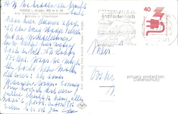 72063009 alte Postkarte Fuessen Allgaeu Alte Stadtmauer Franziskanerkloster Schlicke postalisch gelaufen Erhaltung siehe scans KatCode: 11110009777129