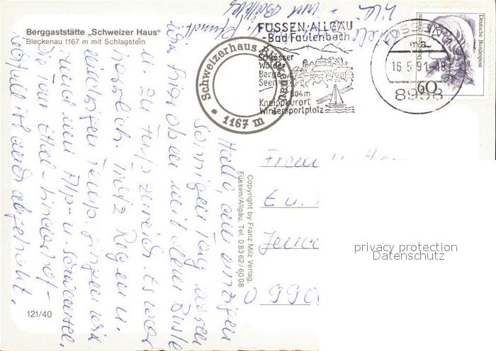 71829444 alte Postkarte Fuessen Allgaeu Berggaststaette Schweizer Haus Bleckenau mit Schlagstein postalisch gelaufen Erhaltung siehe scans KatCode: 11110009777129