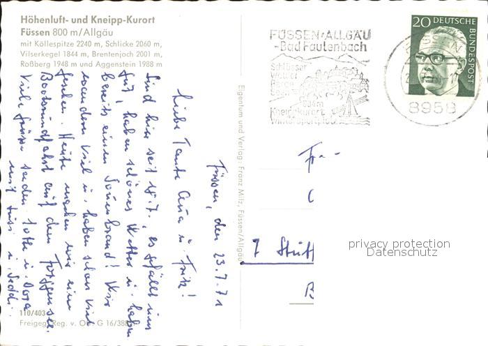 72612270 alte Postkarte Fuessen Allgaeu Fliegeraufnahme postalisch gelaufen Erhaltung siehe scans [AndreD76] KatCode: 11110009777129