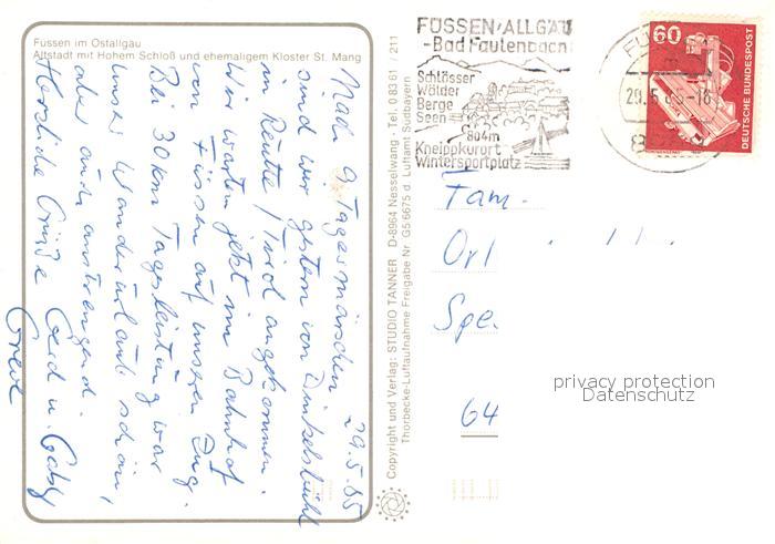 73173138 alte Postkarte Fuessen Allgaeu Fliegeraufnahme Altstadt mit Hohem Schloss und Kloster St. Mang postalisch gelaufen Erhaltung siehe scans [LiesaD40] KatCode: 11110009777129